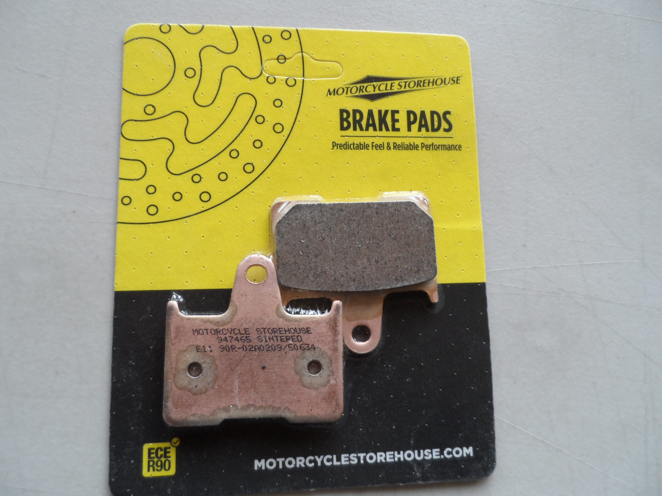 Sintered. ECE R 90 certified. When you hit the brakes you want no surprises. Motorcycle Storehouse brake pads are designed, tested to do job as you expect, offering performance and safety when you need it most. Pros: Brake pads with sintered friction material offer a longer life, will handle heat better than organic pads and have a fast reaction time in both dry and wet with excellent stopping performance. Best for more aggressive riding styles and the best for any weather performance. Cons: The metal particles used in the pads will ‘eat away’ at the brake rotor quicker than organic pads. Not for use on brake rotors of older models that are not ‘sintered pads certified’ to prevent extreme rotor wear.